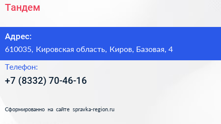 Тандем по адресу 610035, Кировская область, Киров, Базовая, 4 в дальнейшем Организация, размещена в следующих категориях: