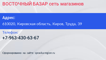 ВОСТОЧНЫЙ БАЗАР, сеть магазинов по адресу 610020, Кировская область, Киров, Труда, 39 в дальнейшем Организация, размещена в следующих категориях: