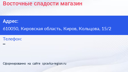Восточные сладости, магазин по адресу 610050, Кировская область, Киров, Кольцова, 15/2 в дальнейшем Организация, размещена в следующих категориях: