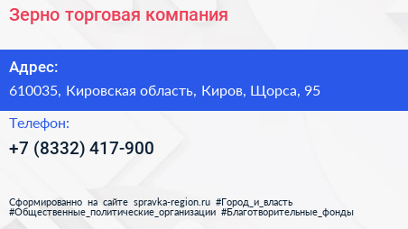 Зерно, торговая компания по адресу 610035, Кировская область, Киров, Щорса, 95 в дальнейшем Организация, размещена в следующих категориях: