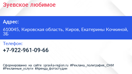 Зуевское любимое! по адресу 610045, Кировская область, Киров, Екатерины Кочкиной, 3Б в дальнейшем Организация, размещена в следующих категориях: