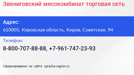 Звениговский мясокомбинат, торговая сеть по адресу 610005, Кировская область, Киров, Советская, 94 в дальнейшем Организация, размещена в следующих категориях: