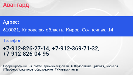 Авангард по адресу 610021, Кировская область, Киров, Солнечная, 14 в дальнейшем Организация, размещена в следующих категориях: