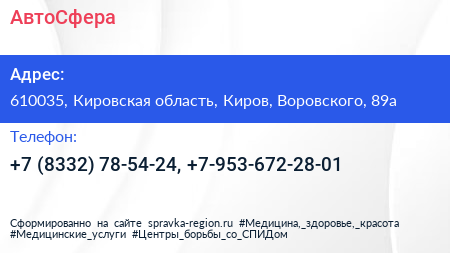 АвтоСфера по адресу 610035, Кировская область, Киров, Воровского, 89а в дальнейшем Организация, размещена в следующих категориях: