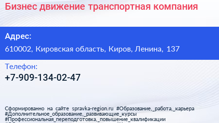 Бизнес движение, транспортная компания по адресу 610002, Кировская область, Киров, Ленина, 137 в дальнейшем Организация, размещена в следующих категориях:
