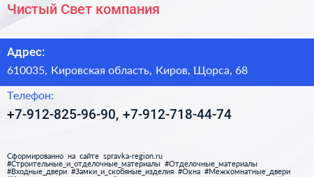 Чистый Свет, компания по адресу 610035, Кировская область, Киров, Щорса, 68 в дальнейшем Организация, размещена в следующих категориях: