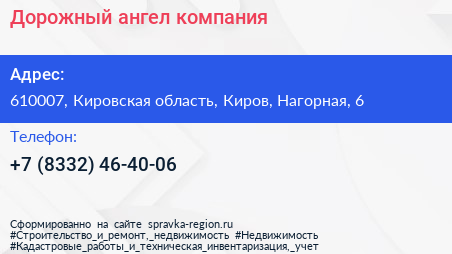 Дорожный ангел, компания по адресу 610007, Кировская область, Киров, Нагорная, 6 в дальнейшем Организация, размещена в следующих категориях: