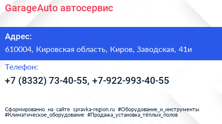 GarageAuto, автосервис по адресу 610004, Кировская область, Киров, Заводская, 41и в дальнейшем Организация, размещена в следующих категориях: