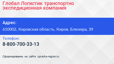 Глобал Логистик, транспортно-экспедиционная компания по адресу 610002, Кировская область, Киров, Блюхера, 39 в дальнейшем Организация, размещена в следующих категориях: