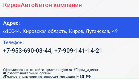 КировАвтоБетон, компания по адресу 610044, Кировская область, Киров, Луганская, 49 в дальнейшем Организация, размещена в следующих категориях: