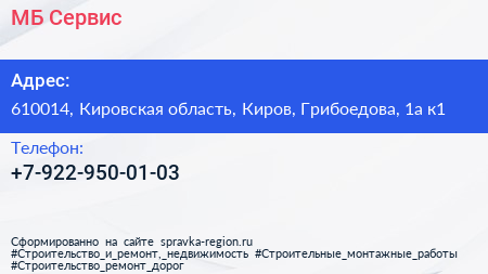 МБ Сервис по адресу 610014, Кировская область, Киров, Грибоедова, 1а к1 в дальнейшем Организация, размещена в следующих категориях:
