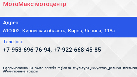 МотоМакс, мотоцентр по адресу 610002, Кировская область, Киров, Ленина, 119а в дальнейшем Организация, размещена в следующих категориях: