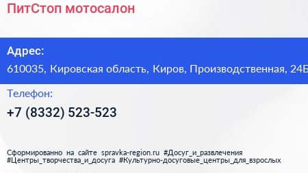 ПитСтоп, мотосалон по адресу 610035, Кировская область, Киров, Производственная, 24Б в дальнейшем Организация, размещена в следующих категориях: