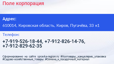 Поле, корпорация по адресу 610014, Кировская область, Киров, Пугачёва, 33 к1 в дальнейшем Организация, размещена в следующих категориях: