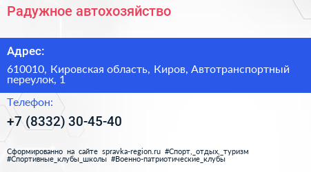 Радужное, автохозяйство по адресу 610010, Кировская область, Киров, Автотранспортный переулок, 1 в дальнейшем Организация, размещена в следующих категориях: