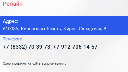 Релайн по адресу 610035, Кировская область, Киров, Складская, 9 в дальнейшем Организация, размещена в следующих категориях: