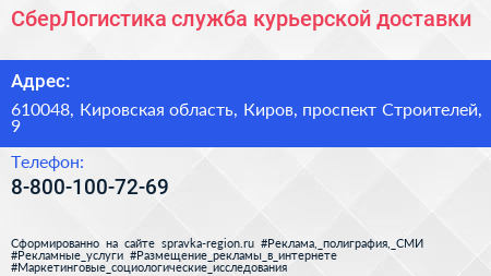 СберЛогистика, служба курьерской доставки по адресу 610048, Кировская область, Киров, проспект Строителей, 9 в дальнейшем Организация, размещена в следующих категориях: