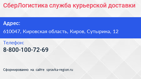 СберЛогистика, служба курьерской доставки по адресу 610047, Кировская область, Киров, Сутырина, 12 в дальнейшем Организация, размещена в следующих категориях: