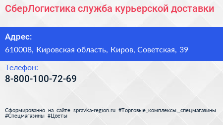 СберЛогистика, служба курьерской доставки по адресу 610008, Кировская область, Киров, Советская, 39 в дальнейшем Организация, размещена в следующих категориях: