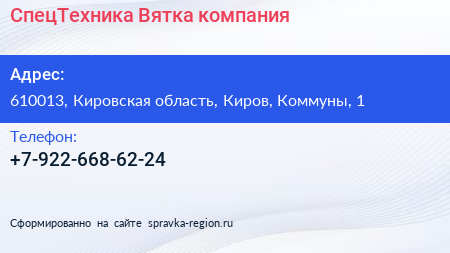 СпецТехника-Вятка, компания по адресу 610013, Кировская область, Киров, Коммуны, 1 в дальнейшем Организация, размещена в следующих категориях: