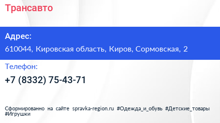 Трансавто по адресу 610044, Кировская область, Киров, Сормовская, 2 в дальнейшем Организация, размещена в следующих категориях: