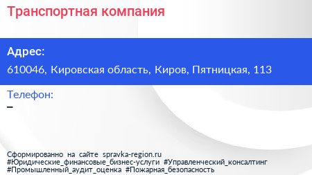 Транспортная компания по адресу 610046, Кировская область, Киров, Пятницкая, 113 в дальнейшем Организация, размещена в следующих категориях: