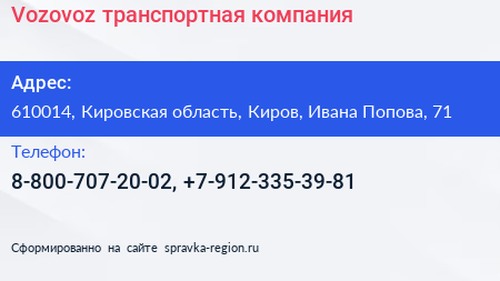 Vozovoz, транспортная компания по адресу 610014, Кировская область, Киров, Ивана Попова, 71 в дальнейшем Организация, размещена в следующих категориях: