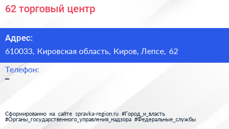 №62, торговый центр по адресу 610033, Кировская область, Киров, Лепсе, 62 в дальнейшем Организация, размещена в следующих категориях: