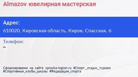 Almazov, ювелирная мастерская по адресу 610020, Кировская область, Киров, Спасская, 6 в дальнейшем Организация, размещена в следующих категориях: