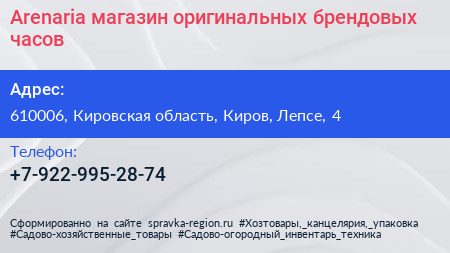 Arenaria, магазин оригинальных брендовых часов по адресу 610006, Кировская область, Киров, Лепсе, 4 в дальнейшем Организация, размещена в следующих категориях: