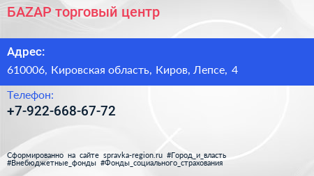 БАZАР, торговый центр по адресу 610006, Кировская область, Киров, Лепсе, 4 в дальнейшем Организация, размещена в следующих категориях: