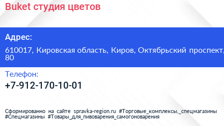 Buket, студия цветов по адресу 610017, Кировская область, Киров, Октябрьский проспект, 80 в дальнейшем Организация, размещена в следующих категориях: