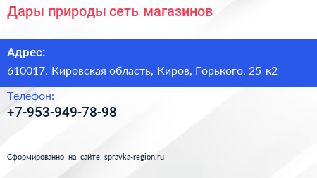 Дары природы, сеть магазинов по адресу 610017, Кировская область, Киров, Горького, 25 к2 в дальнейшем Организация, размещена в следующих категориях: