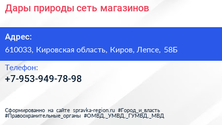 Дары природы, сеть магазинов по адресу 610033, Кировская область, Киров, Лепсе, 58Б в дальнейшем Организация, размещена в следующих категориях: