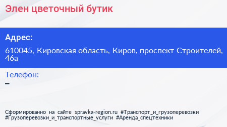 Элен, цветочный бутик по адресу 610045, Кировская область, Киров, проспект Строителей, 46а в дальнейшем Организация, размещена в следующих категориях: