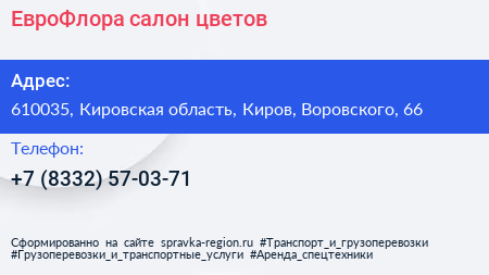 ЕвроФлора, салон цветов по адресу 610035, Кировская область, Киров, Воровского, 66 в дальнейшем Организация, размещена в следующих категориях: