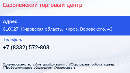 Европейский, торговый центр по адресу 610027, Кировская область, Киров, Воровского, 43 в дальнейшем Организация, размещена в следующих категориях: