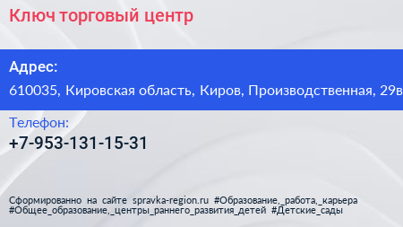 Ключ, торговый центр по адресу 610035, Кировская область, Киров, Производственная, 29в в дальнейшем Организация, размещена в следующих категориях: