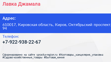Лавка Джамала по адресу 610017, Кировская область, Киров, Октябрьский проспект, 94 в дальнейшем Организация, размещена в следующих категориях: