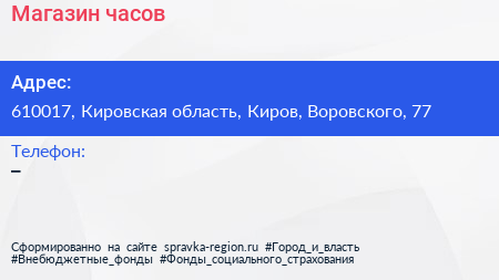 Магазин часов по адресу 610017, Кировская область, Киров, Воровского, 77 в дальнейшем Организация, размещена в следующих категориях:
