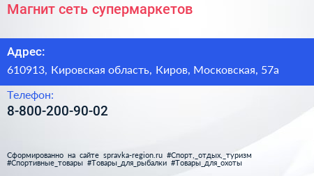 Магнит, сеть супермаркетов по адресу 610913, Кировская область, Киров, Московская, 57а в дальнейшем Организация, размещена в следующих категориях: