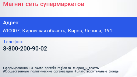Магнит, сеть супермаркетов по адресу 610007, Кировская область, Киров, Ленина, 191 в дальнейшем Организация, размещена в следующих категориях: