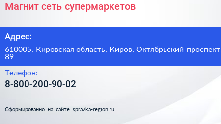 Магнит, сеть супермаркетов по адресу 610005, Кировская область, Киров, Октябрьский проспект, 89 в дальнейшем Организация, размещена в следующих категориях: