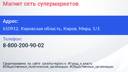 Магнит, сеть супермаркетов по адресу 610912, Кировская область, Киров, Мира, 1/1 в дальнейшем Организация, размещена в следующих категориях: