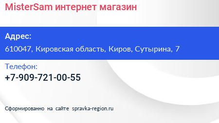 MisterSam, интернет-магазин по адресу 610047, Кировская область, Киров, Сутырина, 7 в дальнейшем Организация, размещена в следующих категориях:
