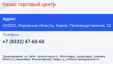 Оазис, торговый центр по адресу 610021, Кировская область, Киров, Производственная, 12 в дальнейшем Организация, размещена в следующих категориях: