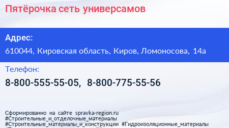 Пятёрочка, сеть универсамов по адресу 610044, Кировская область, Киров, Ломоносова, 14а в дальнейшем Организация, размещена в следующих категориях: