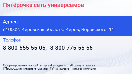 Пятёрочка, сеть универсамов по адресу 610002, Кировская область, Киров, Воровского, 11 в дальнейшем Организация, размещена в следующих категориях: