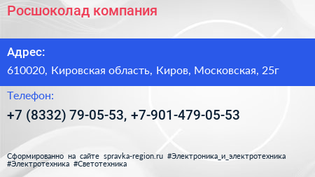 Росшоколад, компания по адресу 610020, Кировская область, Киров, Московская, 25г в дальнейшем Организация, размещена в следующих категориях: