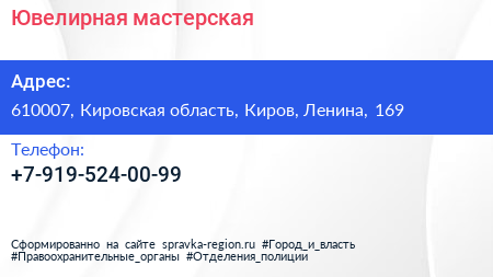 Ювелирная мастерская по адресу 610007, Кировская область, Киров, Ленина, 169 в дальнейшем Организация, размещена в следующих категориях:
